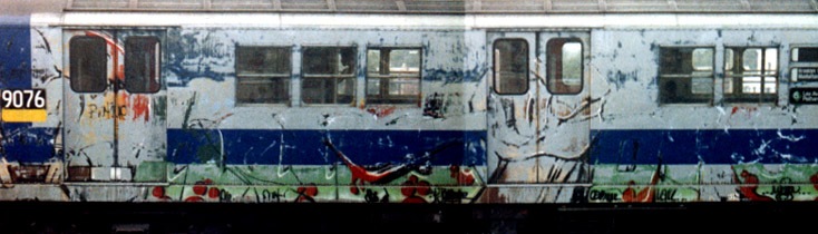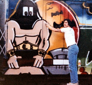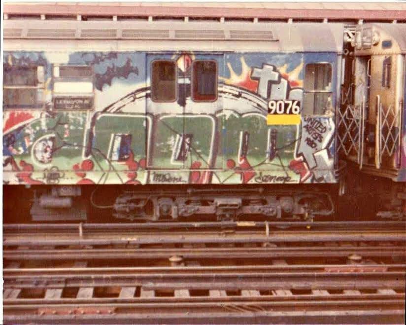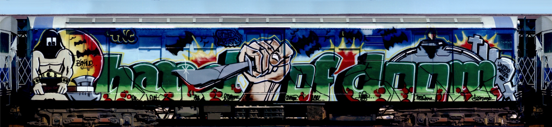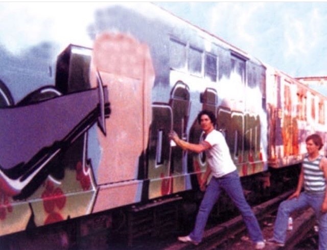 Finally, after about 4 hours of painting, -the “HAND OF DOOM” was finished. Just as I was about to begin painting the next car, I noticed the shadows of the toys cast across the side of the train had disappeared for a moment, then replaced by the shadows of the law! The uniformed police had been watching me in awe! But as soon as they realized that I knew they were there, they began to move in on the boys and me. There were police all over. I quickly ran down the tracks. “JV13,” painting a top to bottom that day, was standing on an old, rusty 55-gallon oil drum. As I ran past him, I fell, knocking the drum over, leaving “JV13” hanging from the train door by his fingertips. At the same time, “PJAY” took a break from it, too! Unfortunately, the police caught him. He played it cool, said he was a photographer, and was passing by. The police believed the story and let him go.